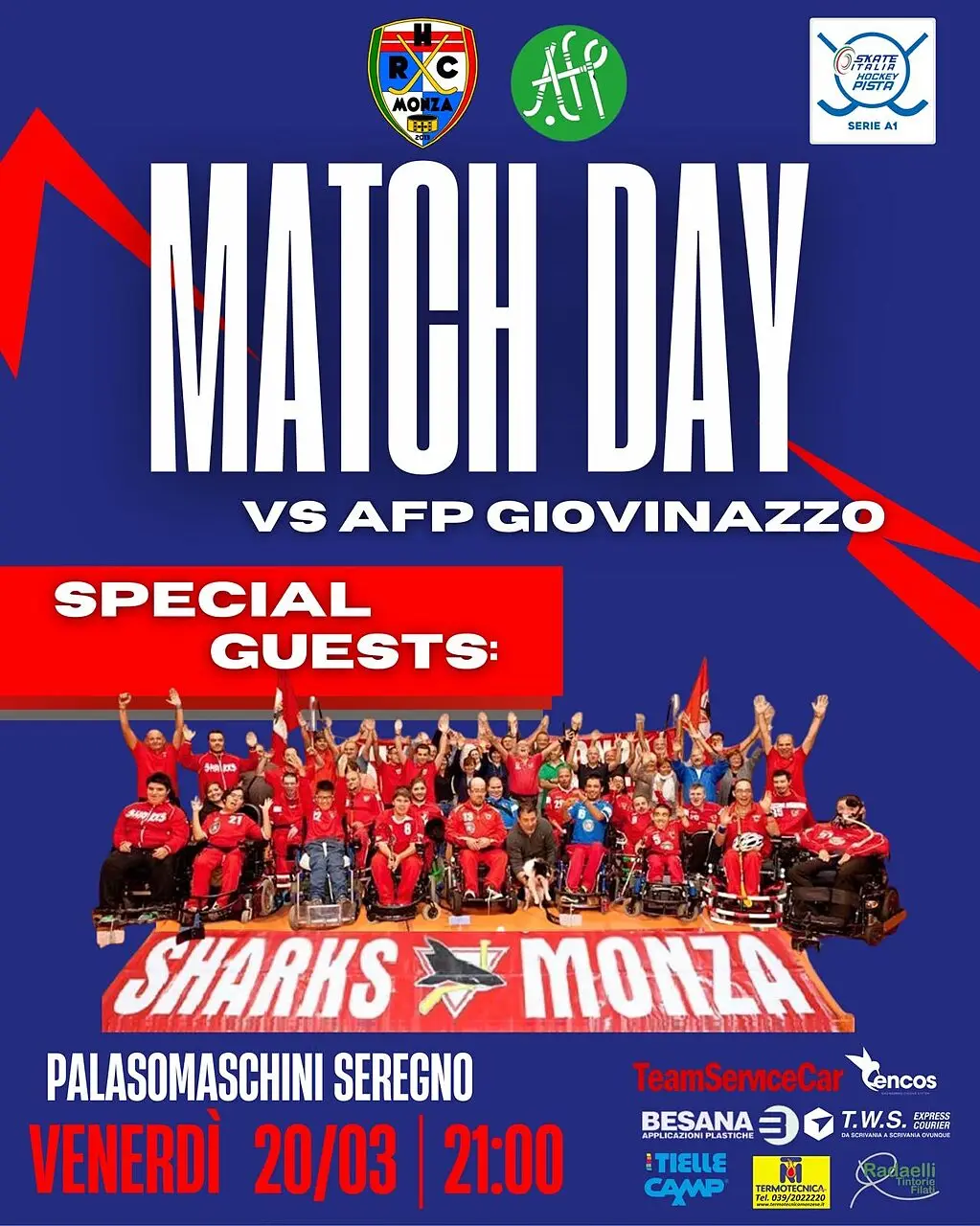 Venerdì sera, in occasione del match TeamServiceCar Monza-AFP Giovinazzo, valido per lla 23’ giornata di Serie A1 di Hockey su Pista, la società avrà il piacere di ospitare una delegazione degli Sharks Monza al PalaSomaschini di Seregno.