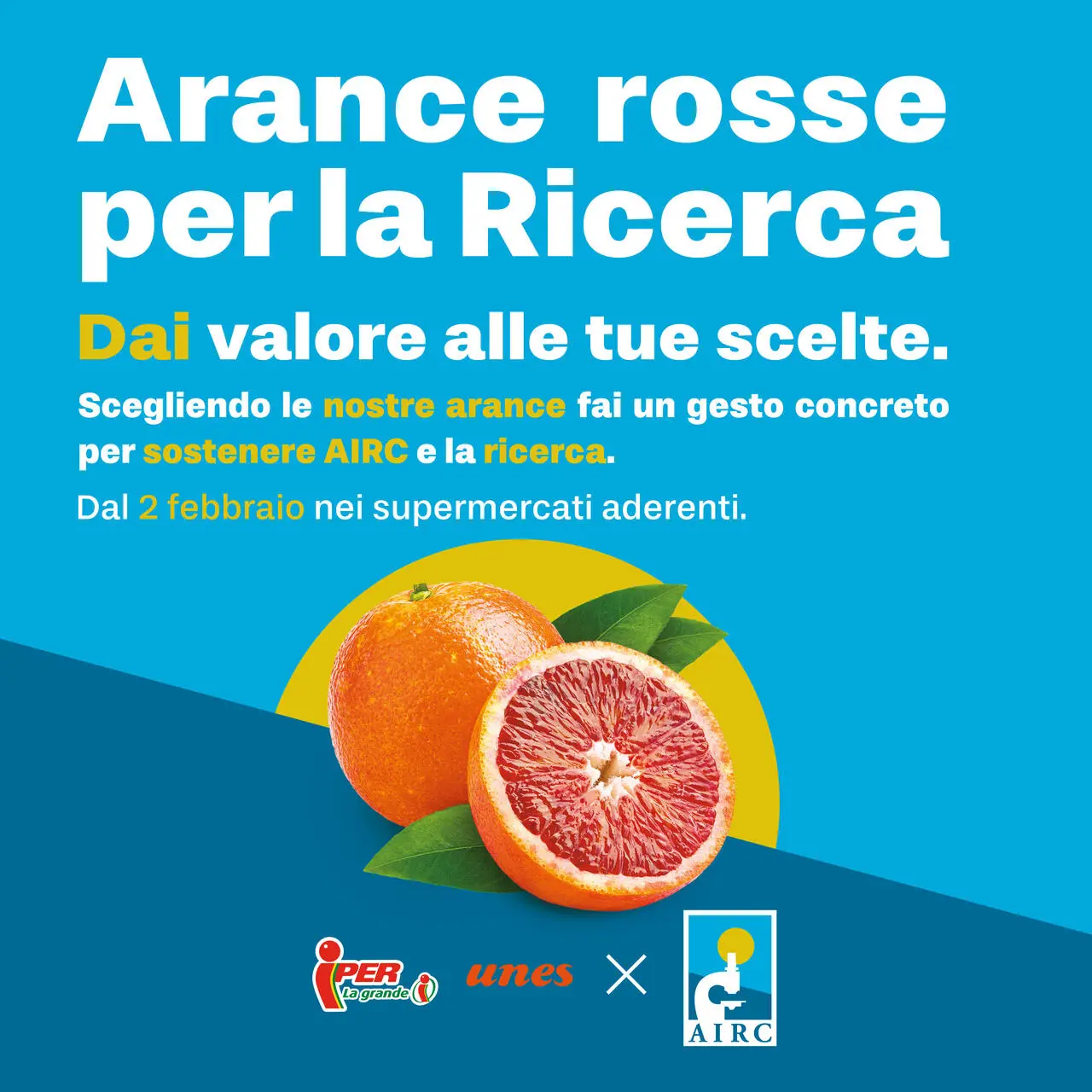 Dal 2 al 16 febbraio, per ogni confezione di “Arance rosse per la Ricerca” venduta, Iper La grande i e i supermercati UNES, aderenti all’iniziativa, doneranno 0,50€ centesimi a Fondazione AIRC*: un gesto concreto per sostenere il lavoro dei ricercatori e contribuire al finanziamento dei progetti di ricerca in campo oncologico.