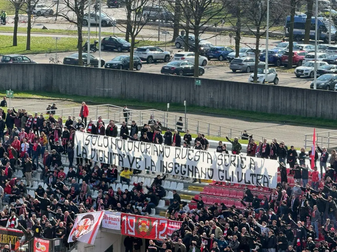 Le squadre scendono in campo e la Curva Sud accoglie il Monza con uno striscione
