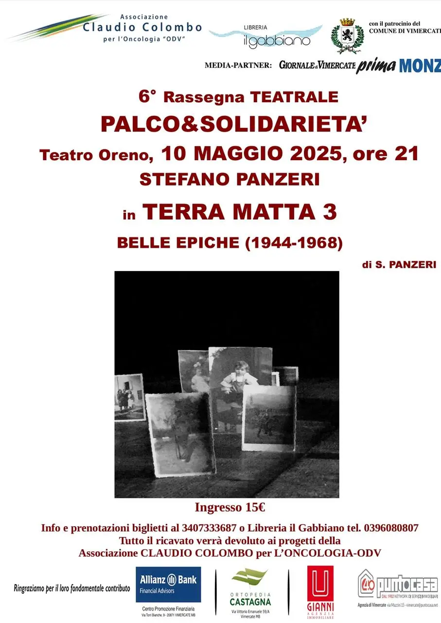 Il prossimo 10 maggio 2025, alle ore 21, al Teatro Oreno andrà in scena l’ultimo appuntamento della sesta edizione di Palco & Solidarietà, con lo spettacolo “Terra Matta 3 - Belle Epiche (1944-1968)”. Protagonista sarà Stefano Panzeri, che porterà sul palco la terza tappa del viaggio epico e struggente di Vincenzo Rabito, bracciante siciliano semianalfabeta classe 1899, testimone inconsapevole di un’Italia in tumulto.