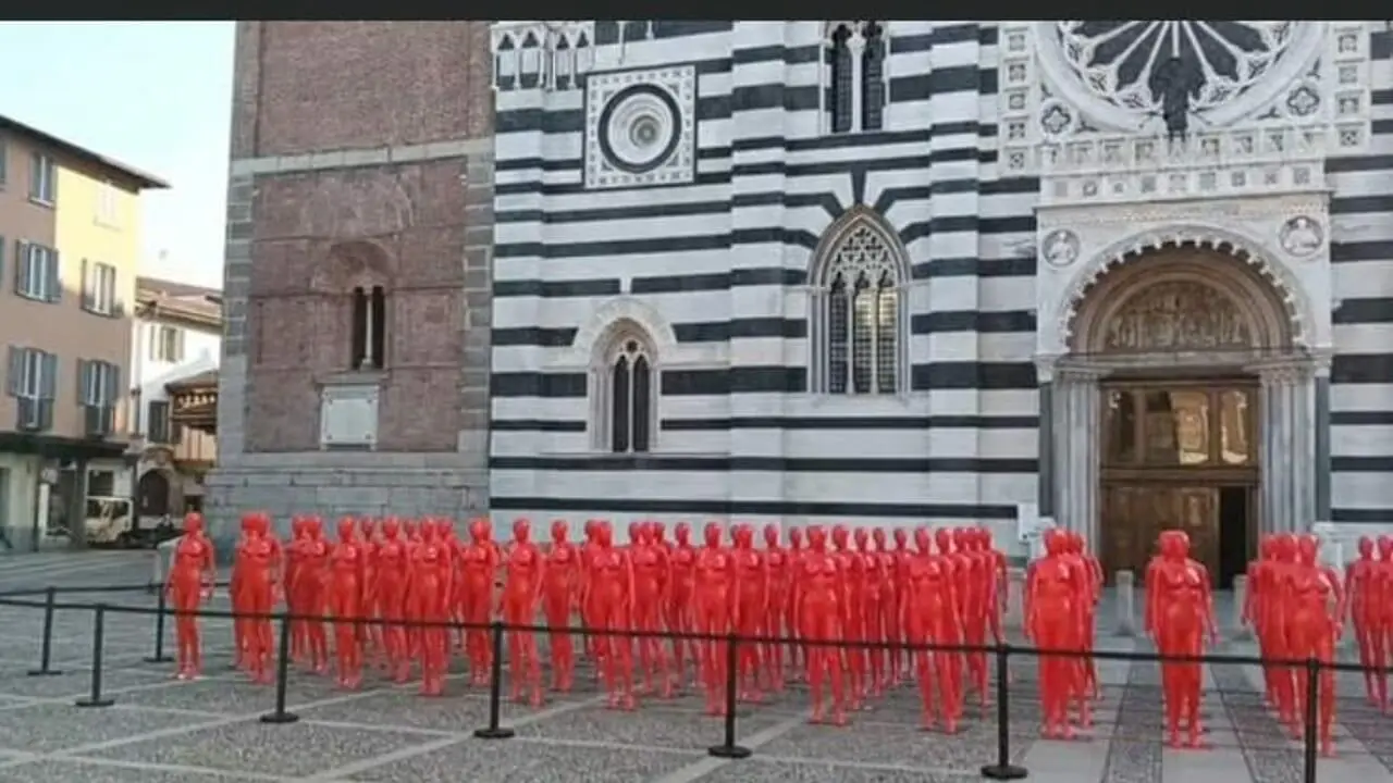 C'è qualcosa di inquietante nella geometria perfetta di quei manichini rossi, allineati come un piccolo esercito immobile davanti al Duomo di Monza. Più di cento figure femminili dipinte di un rosso violento, quasi urlante, che si stagliano contro la pietra antica della cattedrale. Un'apparizione che ha colto di sorpresa i passanti, costringendoli a fermarsi, a interrogarsi, a guardare.