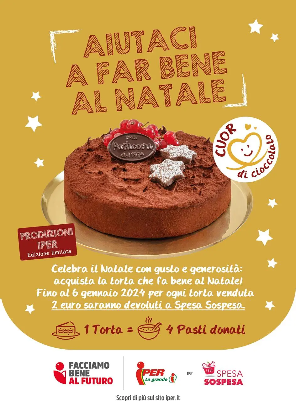 Con l’obbiettivo di diffondere il vero spirito natalizio attraverso l'attenzione e la solidarietà, a partire dal 4 dicembre fino al 6 gennaio 2024, in tutti i punti vendita Iper La grande i, sarà possibile acquistare la torta benefica che fa bene al Natale di produzione Iper, “Cuor di Cioccolato”, in edizione limitata. A fronte dell’acquisto di ogni torta, verranno devoluti 2 euro a SpesaSospesa.org e verranno donati 4 pasti equivalenti* garantendo un sostegno tangibile alle famiglie che necessitano di aiuto in questo periodo festivo. SpesaSospesa.org è un progetto di solidarietà circolare nato nel 2020 per sostenere le persone in difficoltà economica e sociale anche temporanea.