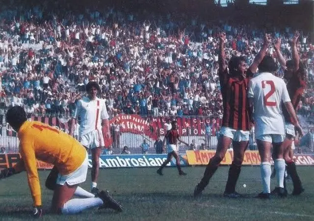 L’affascinante derby sarebbe stato così nuovamente e clamorosamente d’attualità subito nei primi anni ‘80. Il Milan si ritrovò in cadetteria per la prima volta nella sua gloriosa storia e, precisamente il 14 giugno 1981, avrebbe riconquistato subito e matematicamente la massima serie proprio contro il Monza e in un gremito San Siro: decisiva e unica la firma di Walter Novellino. In quella B certamente atipica, i biancorossi chiusero tristemente all’ultimo posto, retrocedendo in Serie C1 senza lottare mai realmente per la salvezza. Uniche note positive i giovanissimi Daniele Massaro (futura stella rossonera) e Paolo Monelli, ceduti alla Fiorentina al termine della stagione. Nonostante il Milan ricalcò, come previsto, prontamente il suo tradizionale palcoscenico, sarebbe presto e nuovamente riscivolato in cadetteria per demeriti sportivi già nel campionato seguente da inedita neopromossa. Così, il 13 marzo 1983, sarebbe andato in scena quello che, per quasi quarant’anni, restò l’ultimo Milan-Monza ufficiale della storia (escludendo, dunque, il già citato precedente dell’agosto 1987).