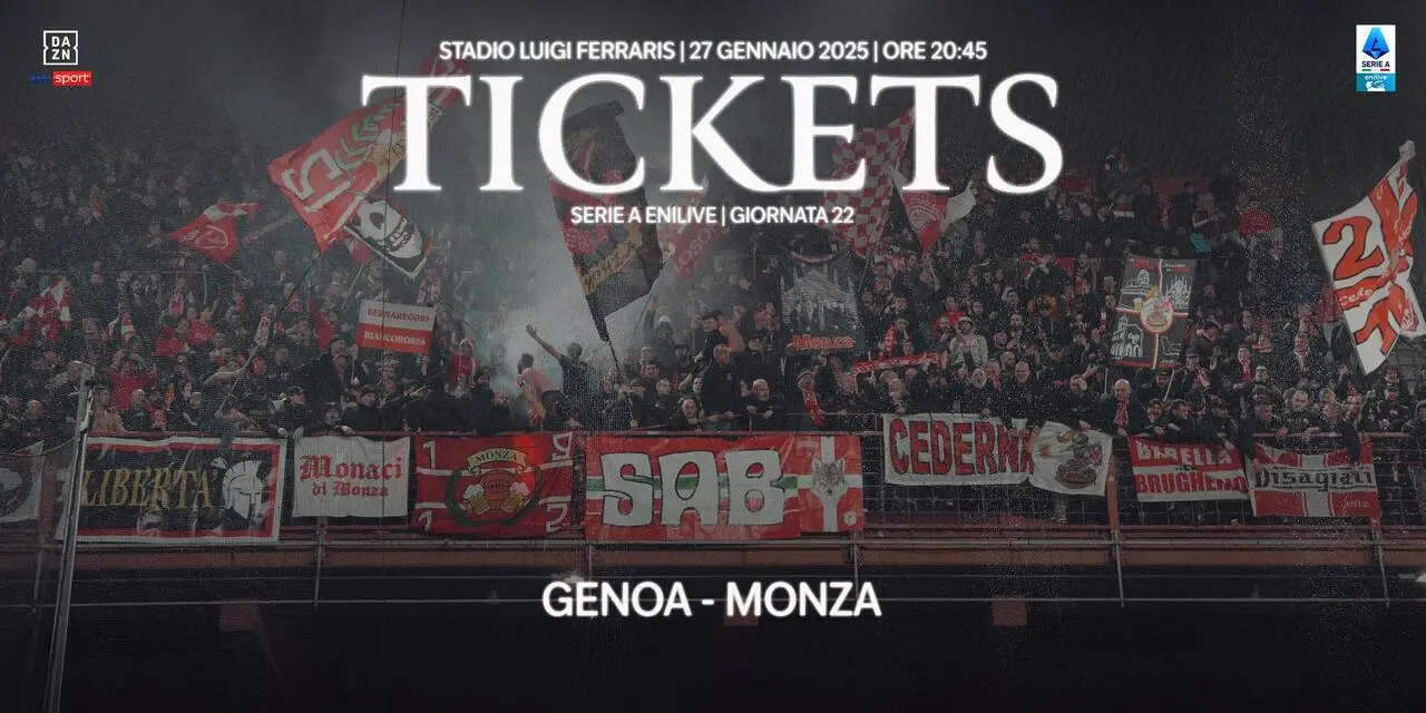 AC Monza informa che sono disponibili i biglietti riservati ai tifosi ospiti che vorranno assistere alla 22^ giornata di Campionato Serie A Enilive, Genoa - Monza, in programma lunedì 27 gennaio 2025 alle ore 20:45 allo stadio Luigi Ferraris.