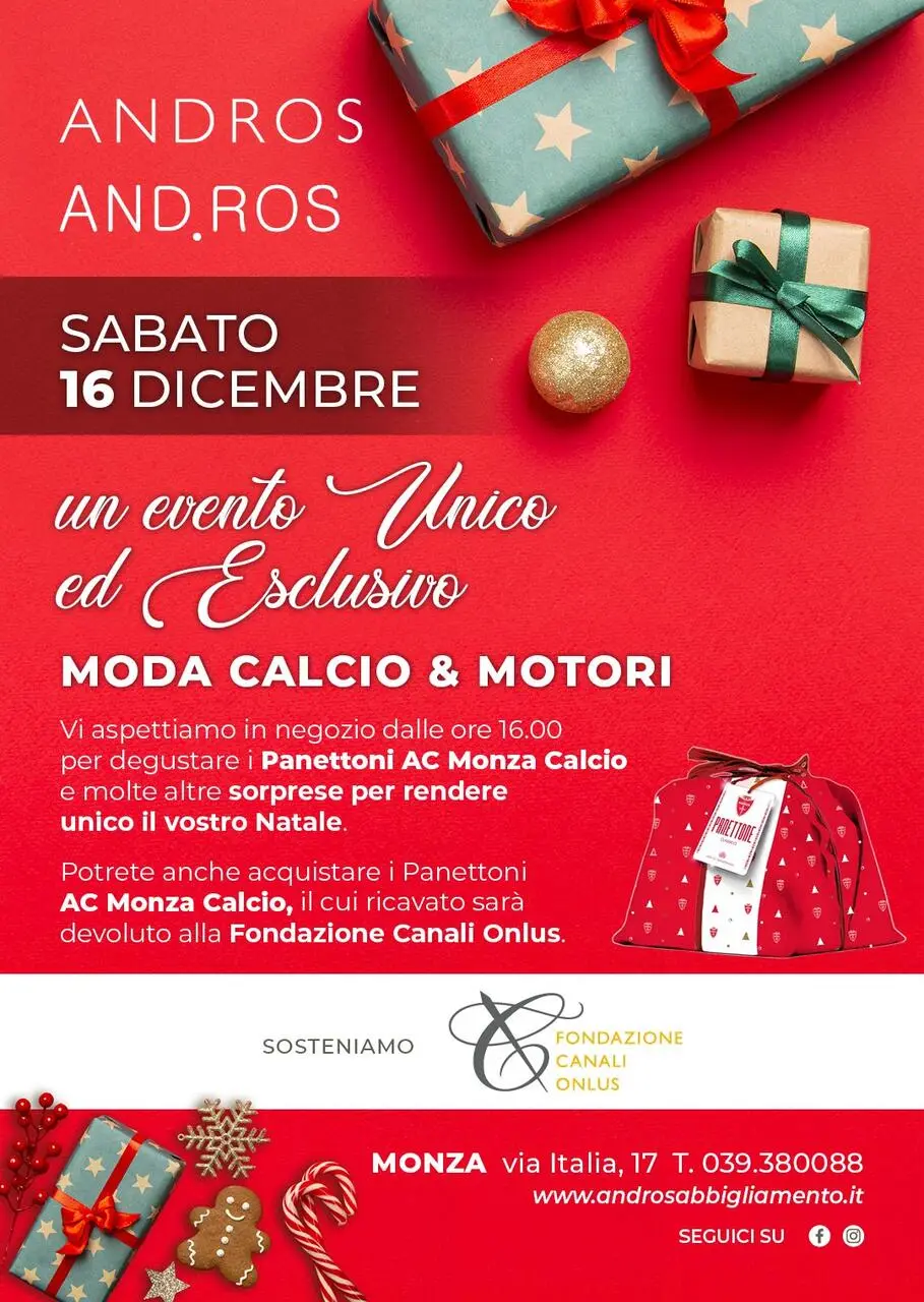 Nel pomeriggio di sabato 16 dicembre ANDROS presenta un evento unico ed esclusivo chiamato ‘Moda, Calcio & Motori’. L’evento ha la finalità di sostenere la Fondazione Canali Onlus, istituita nel 2013 a supporto delle donne che hanno subito violenza. La locandina – naturalmente e rigorosamente biancorossa – annuncia la degustazione dei Panettoni dell’AC Monza Calcio e … ‘molte altre sorprese’. Che saranno davvero tante legate alle tre parole del titolo ‘Moda, Calcio & Motori’. E – sorpresa tra le sorprese – un ospite di grande prestigio. Non possiamo svelare di più: appuntamento, allora, in Via Italia 17 dalle ore 16 per un pomeriggio a forti tinte biancorosse. Fiorenzo Dosso