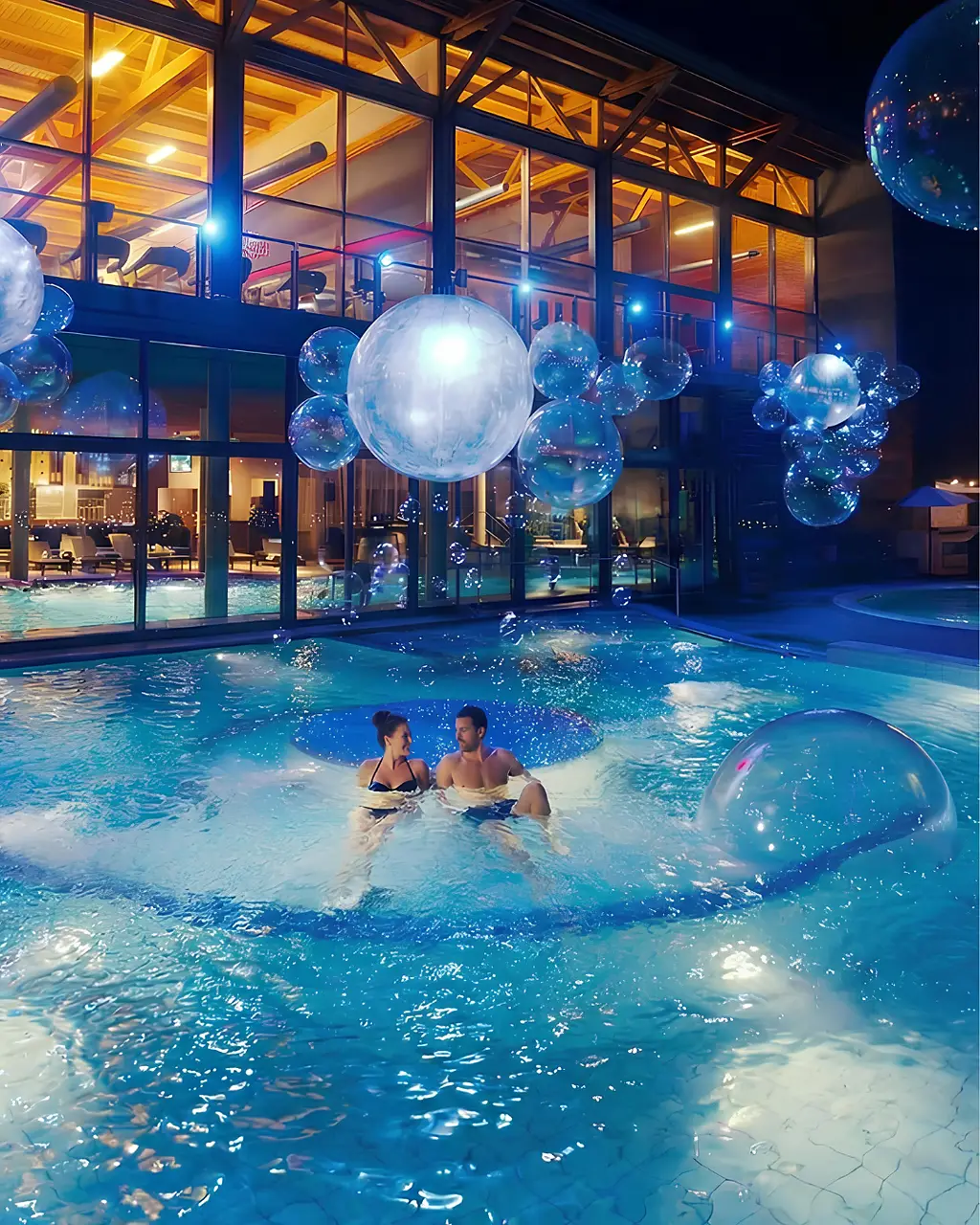 Dalle ore 19:00, gli ambienti della SPA si animano di luci soffuse e riflessi iridescenti nei toni del bianco, perla e champagne, mentre scenografiche bolle fluttuano nell’aria accompagnando gli ospiti lungo un percorso sensoriale tra acqua, musica e suggestioni visive.