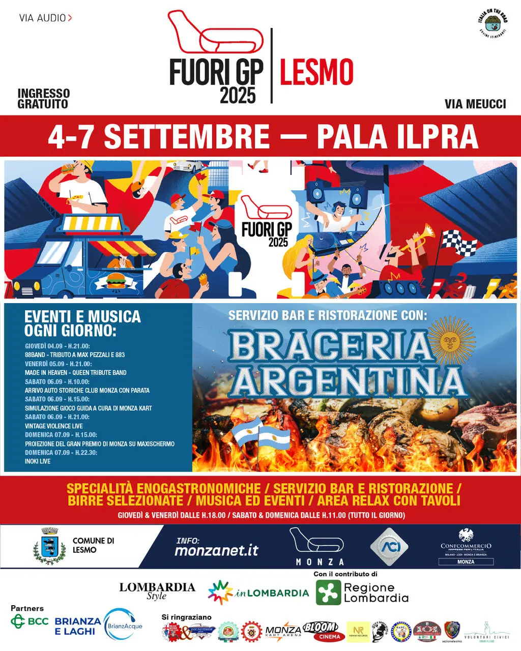 Dal 4 al 7 settembre a Lesmo il Fuori GP 2025: cucina argentina, musica dal vivo ed eventi legati al Gran Premio di Monza.
