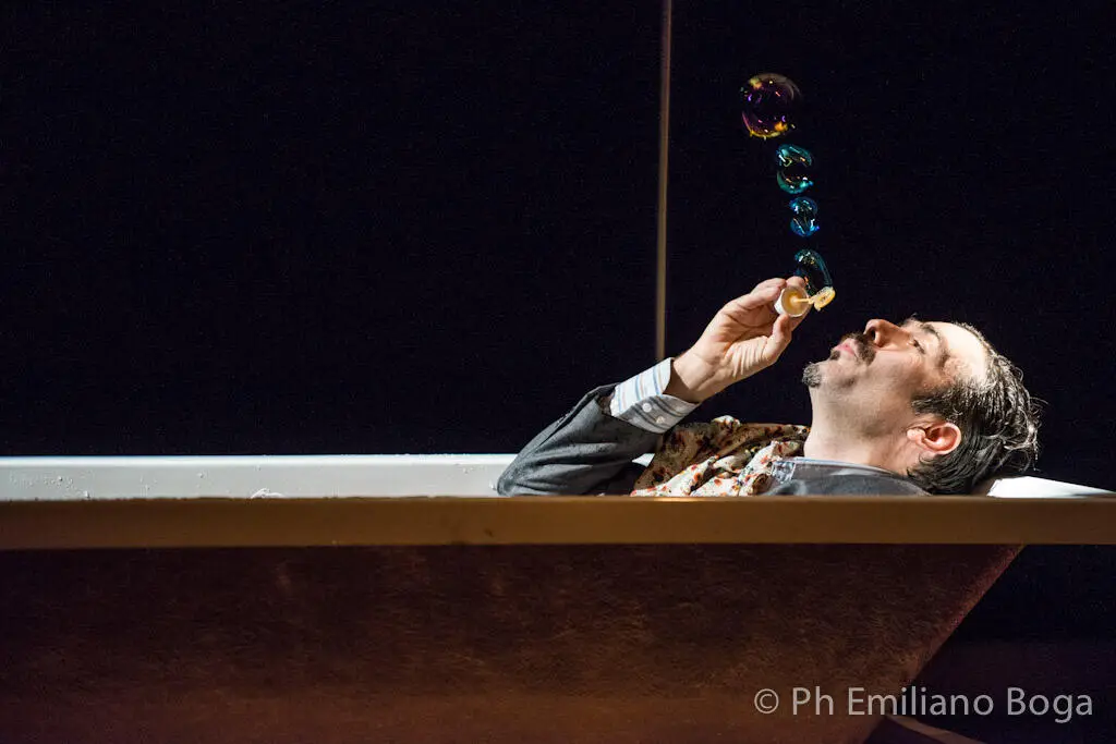 Un attore solo sulla scena affronta i fantasmi di una società allo sbando, aggrappato alla futilità di un oggetto di lusso che, perduta la sua funzione, diviene simbolo del fallimento personale e di un modello di vita. Giovanni parla di noi, del nostro presente, delle nostre illusioni e del bisogno di ricostruirsi. E allora al centro della scena una vasca da bagno piena d’acqua. Acqua che avvolge, che affoga, che allevia, che soffoca. Acqua in cui il protagonista si immerge e contro cui combatte, metafora della fatica di vivere. Acqua che riflette, in cui Giovanni si specchia e non si riconosce più come uomo, come colui che deve provvedere ai bisogni della famiglia. Specchio della vergogna, della perdita di dignità, specchio in cui Giovanni vede il proprio declino. Ma l’acqua è anche il luogo della nascita, di un bambino, di una speranza. Acqua che spinge Giovanni, lo infrange come un’onda fuori dalla disperazione e lo riporta alla vita.