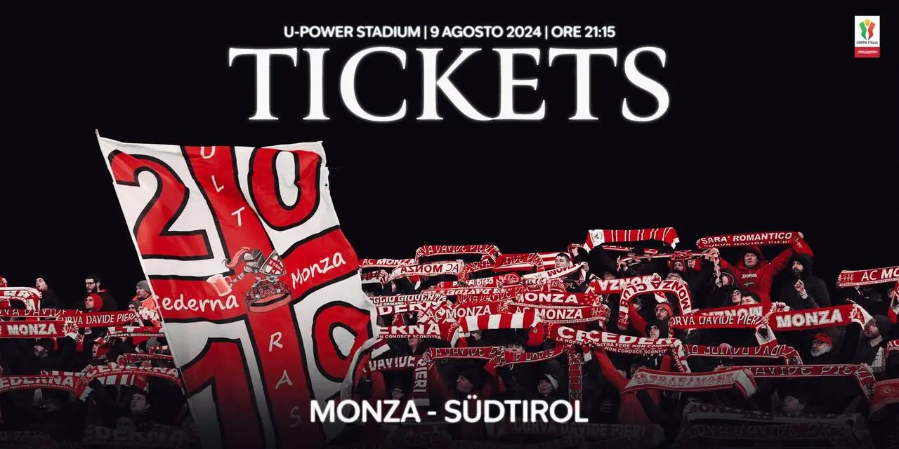 Il Monza informa che dalle ore 10:00 di venerdì 02/08/2024 saranno disponibili i biglietti per il Settore Ospiti per i trentaduesimi di Coppa Italia, Monza - Sudtirol, in programma venerdì 09/08/2024 alle ore 21:15, al prezzo intero di € 10,00 (+ € 2,00 di commissioni di servizio applicate online/ punti vendita).