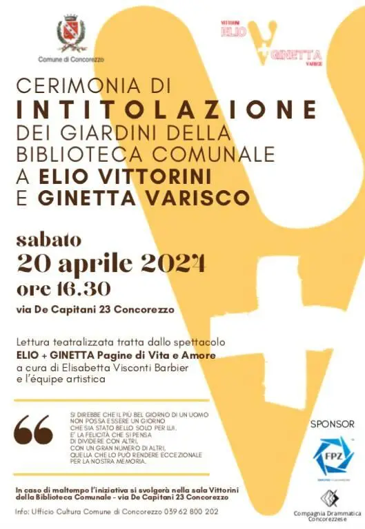 Elio Vittorini e Ginetta Varisco, nonostante un amore proibito, hanno sempre dichiarato il loro profondo attaccamento alla città di Concorezzo. Oggi, le loro spoglie riposano all'interno della tomba privata della famiglia Varisco, un luogo che perpetua l'incontro tra lo scrittore siciliano e la figlia del due volte sindaco Federico Varisco. Questa dedica dei giardini della Biblioteca è un tributo al loro amore per la vita, la cultura e la nostra amata Concorezzo.