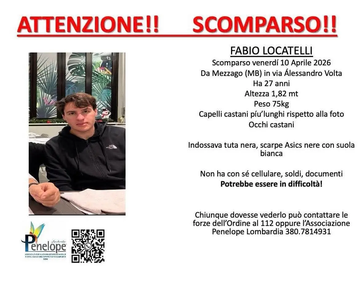 È stato lanciato un appello urgente per un ragazzo scomparso a Mezzago, in provincia di Monza e Brianza. Si tratta di Fabio Locatelli, 27 anni, di cui non si hanno più notizie da venerdì 10 aprile, quando si è allontanato da casa in via Alessandro Volta.
