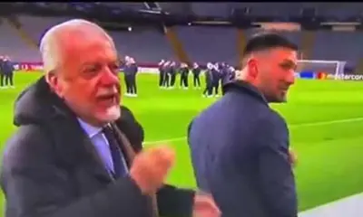 Il presidente del Napoli De Laurentiis sospende l'intervista a Politano e spinge via il cameraman: la risposta di Sky