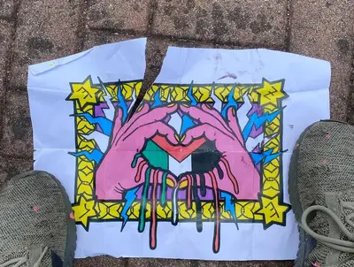 Vicino alla stazione Sobborghi l’opera di JoePalla: due mani formano un cuore che racchiude la bandiera palestinese e un messaggio di denuncia